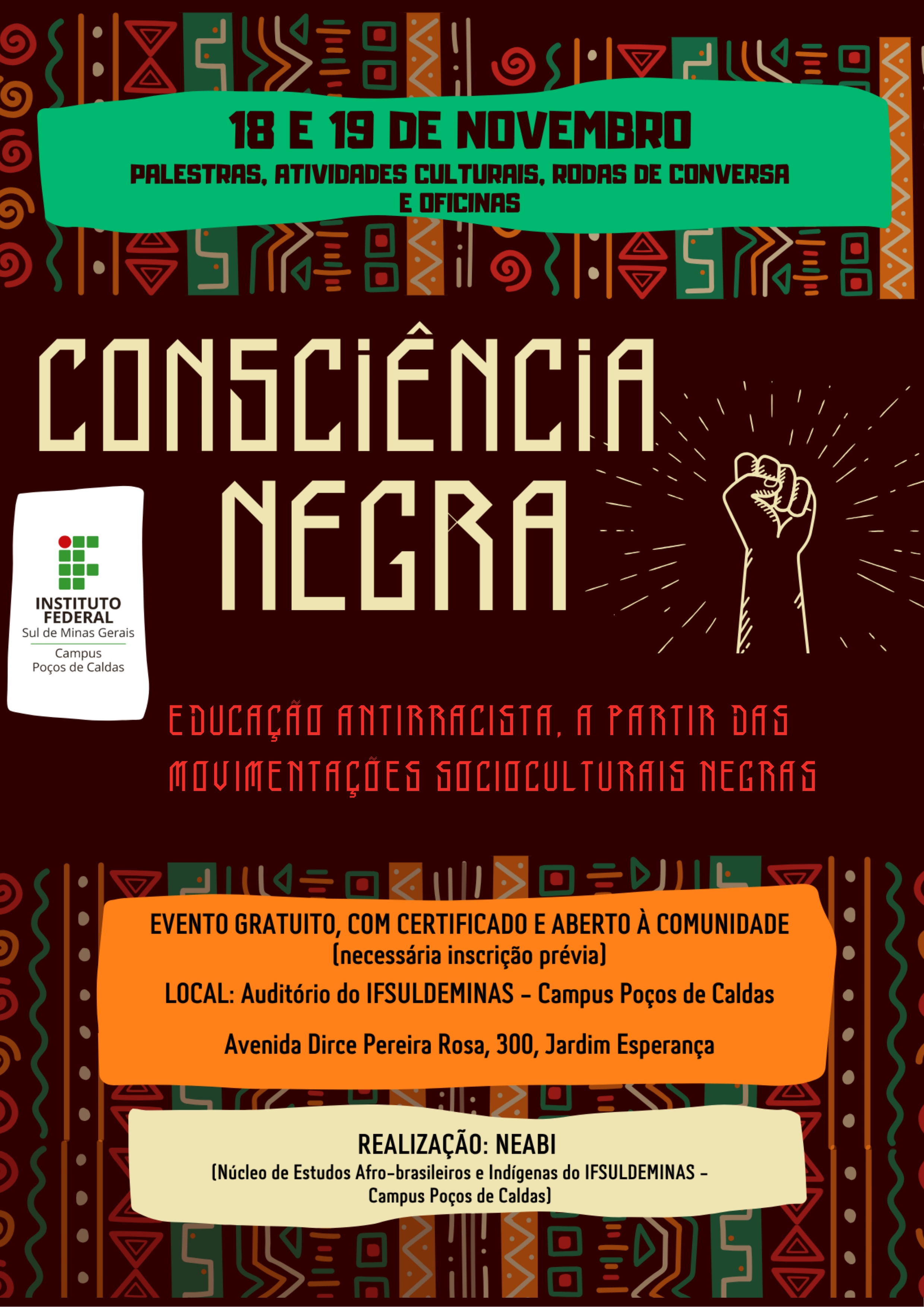 O IFSULDEMINAS – Campus Poços de Caldas promoverá, nos dias 18 e 19 de novembro de 2025, o evento “Consciência Negra: educação antirracista a partir das movimentações socioculturais negras”, organizado pelo Núcleo de Estudos Afro-brasileiros e Indígenas (NEABI). A iniciativa tem como objetivo difundir a cultura afro-brasileira e africana, fortalecer as relações étnico-raciais e promover ações formativas, artísticas e comunitárias com foco na valorização da diversidade.