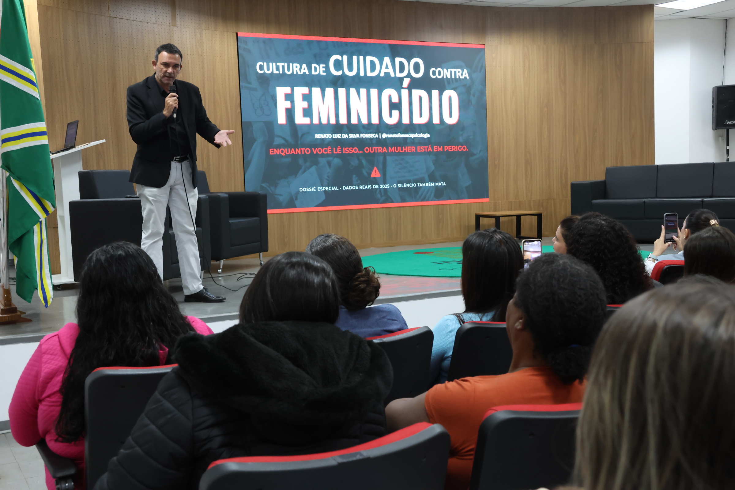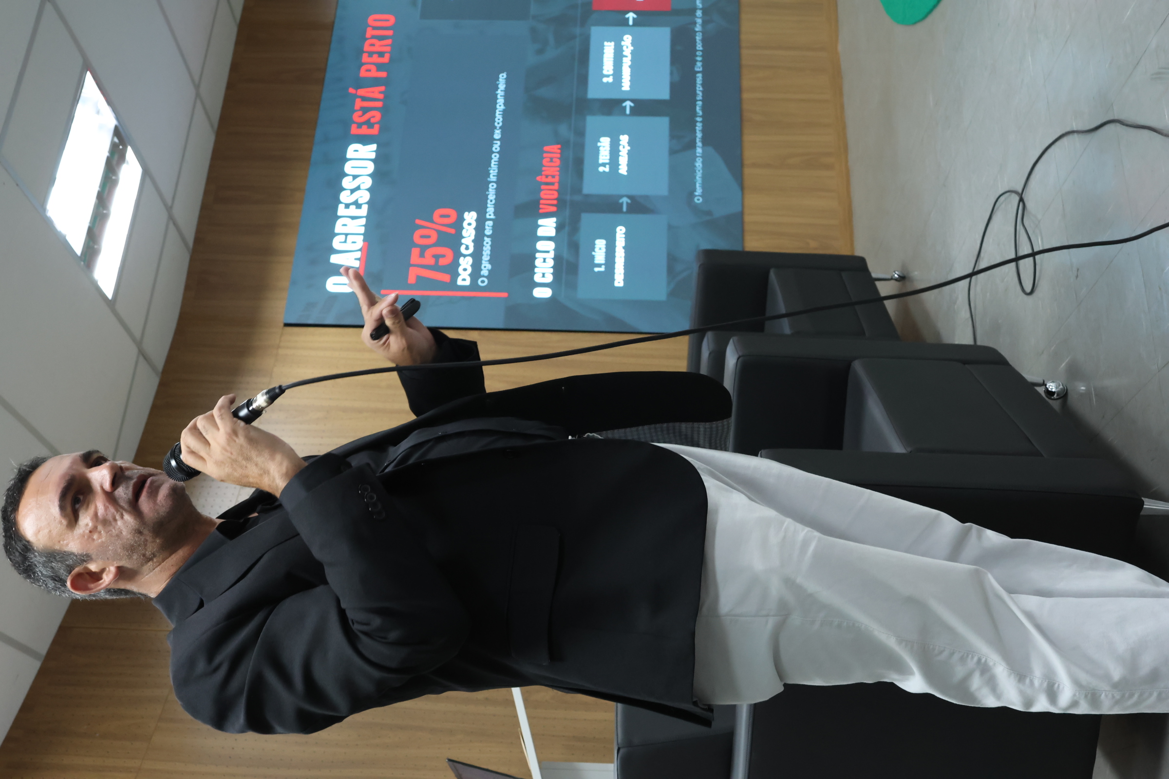 Durante a apresentação, o palestrante trouxe dados objetivos sobre os índices de feminicídio no país, oferecendo um panorama amplo e fundamentado da problemática. Foi destacado que grande parte dos casos ocorre no ambiente doméstico, frequentemente envolvendo pessoas próximas do círculo afetivo das vítimas, como maridos ou companheiros, evidenciando a complexidade e a gravidade desse tipo de violência.