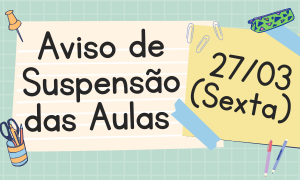 AVISO! Estão suspensas as aulas do próximo dia 27/03, nos períodos da manhã e tarde. Confira aqui!